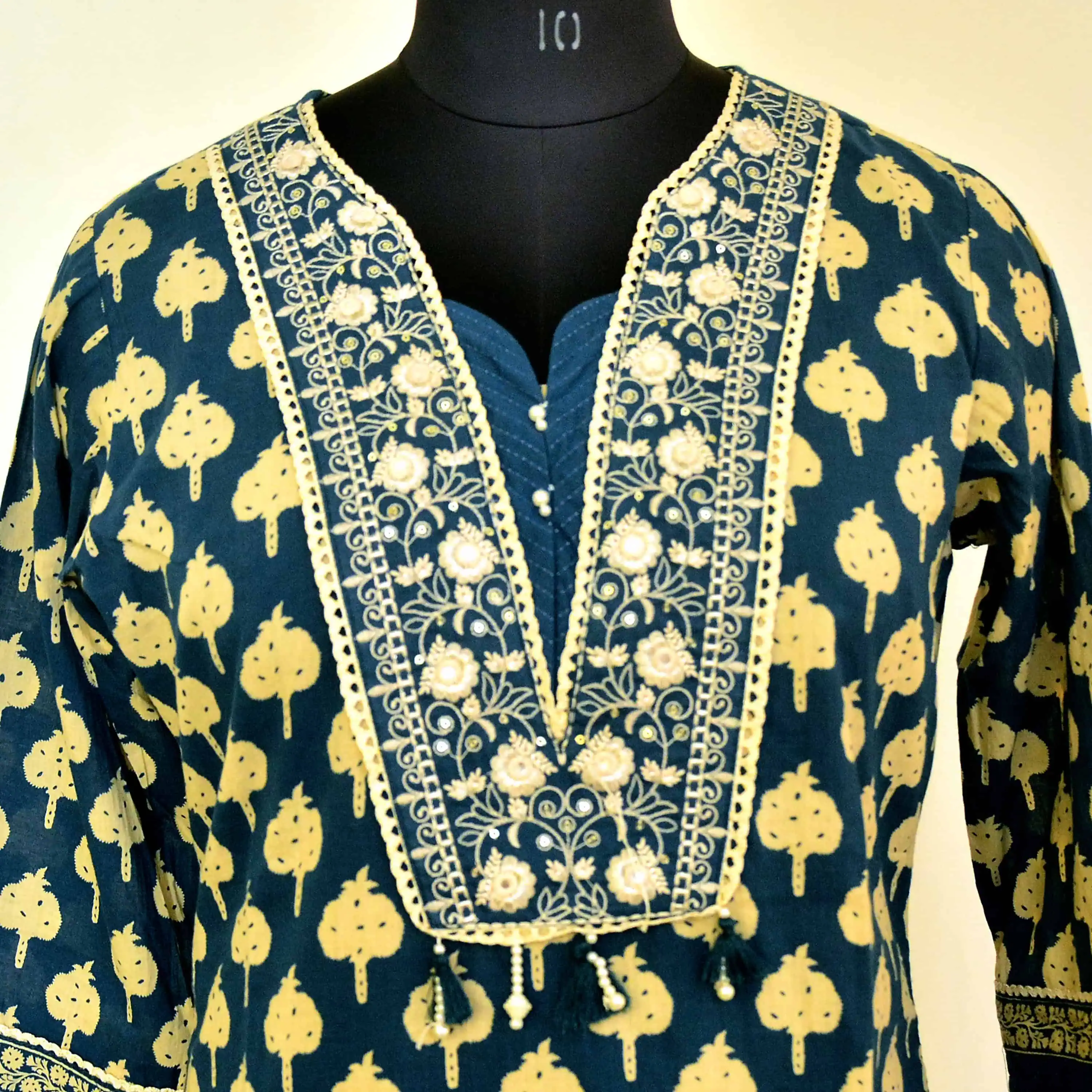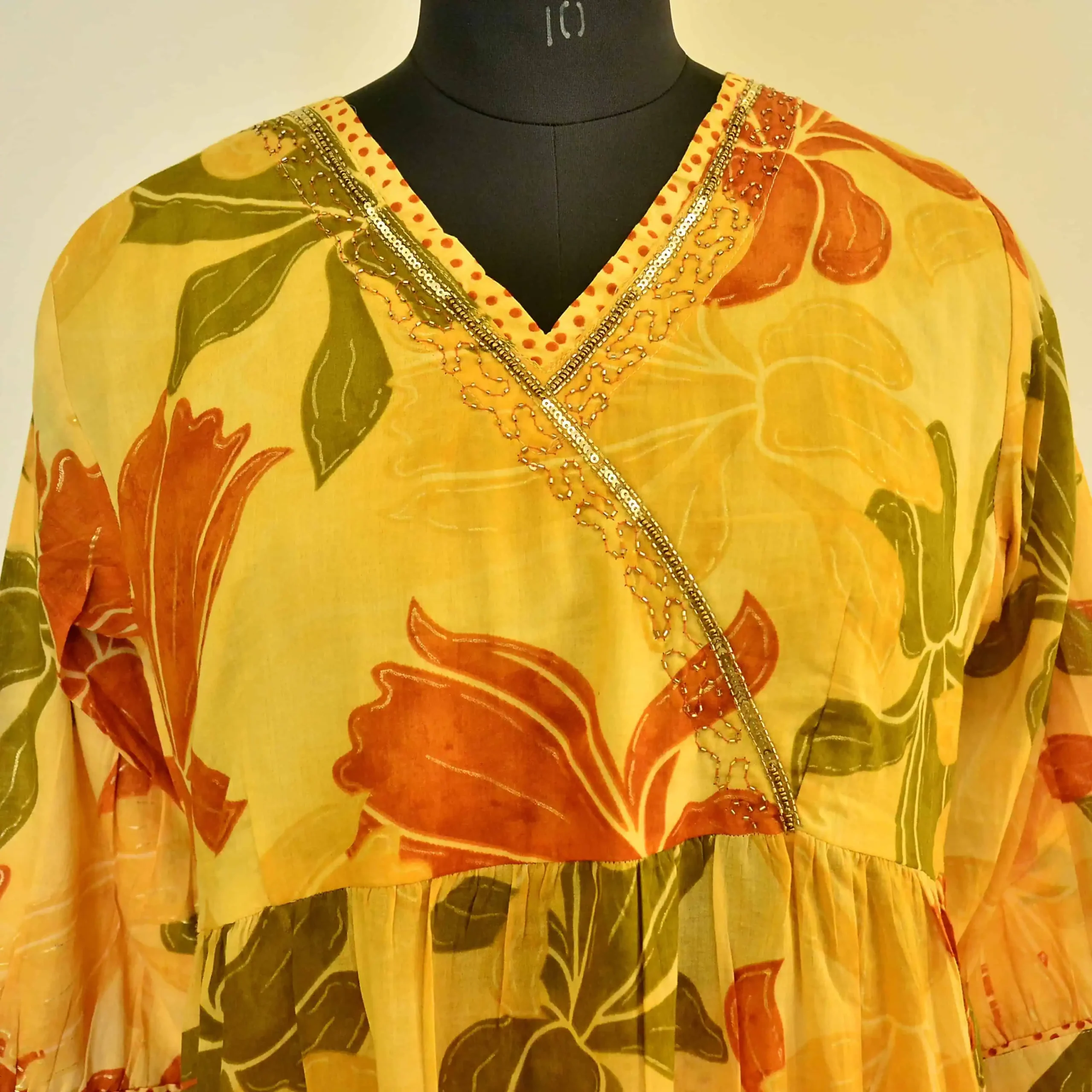 Add a refreshing charm to your ethnic collection with CraftEarth Women Floral Print Angrakha Suit Set with Dupatta. Crafted from soft and breathable cotton, this set features a adorned with delicate floral hand block prints. The V neckline with minimal detailing and 3/4th sleeves gives it a graceful touch. Paired with a solid bottom and a beautifully printed dupatta, this suit set is perfect for festive occasions, office wear, or casual outings, offering a blend of comfort and timeless elegance.