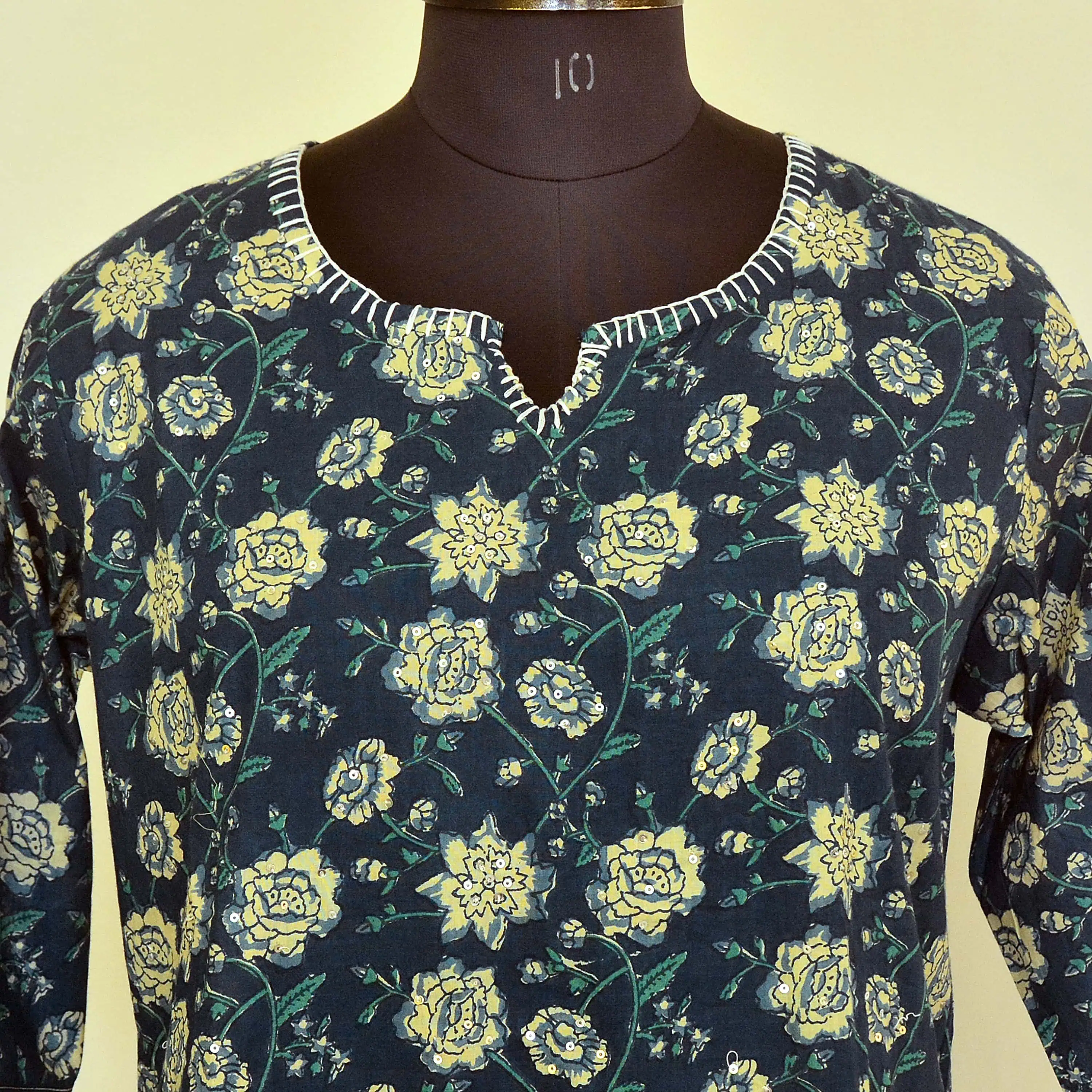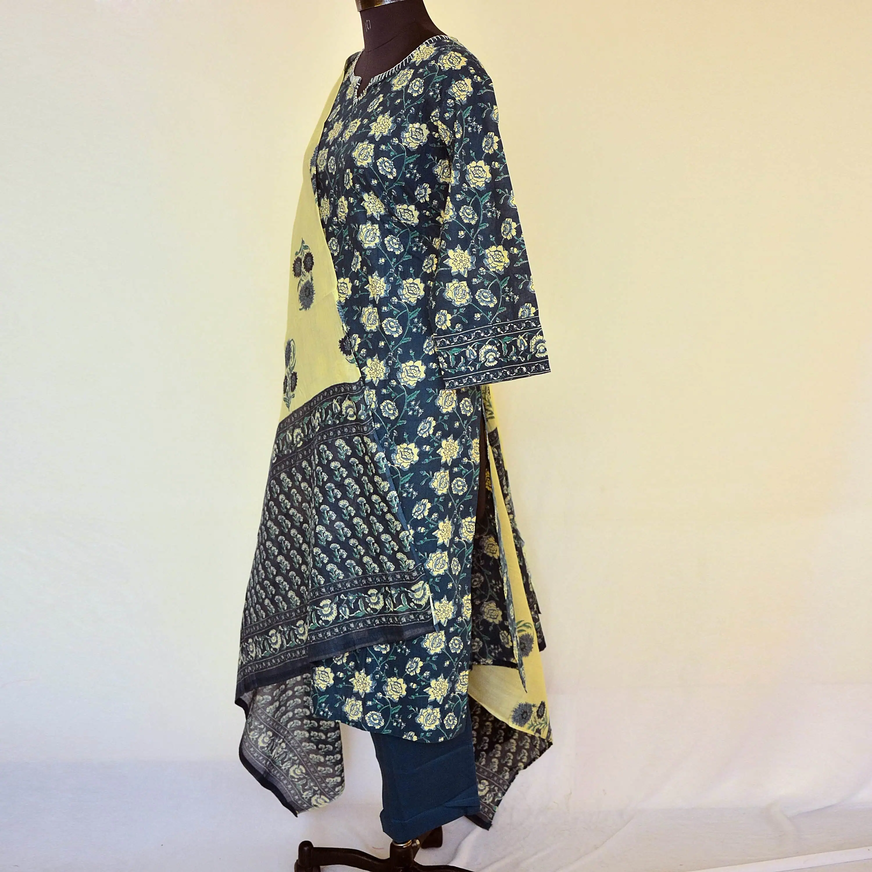 Add a refreshing charm to your ethnic collection with CraftEarth Women’s Blue Straight Cotton Kurta Suit Set with Dupatta. Crafted from soft and breathable cotton, this set features a straight-fit kurta adorned with delicate floral hand block prints. The round neckline with minimal detailing and 3/4th sleeves gives it a graceful touch. Paired with a solid bottom and a beautifully printed dupatta, this suit set is perfect for festive occasions, office wear, or casual outings, offering a blend of comfort and timeless elegance.