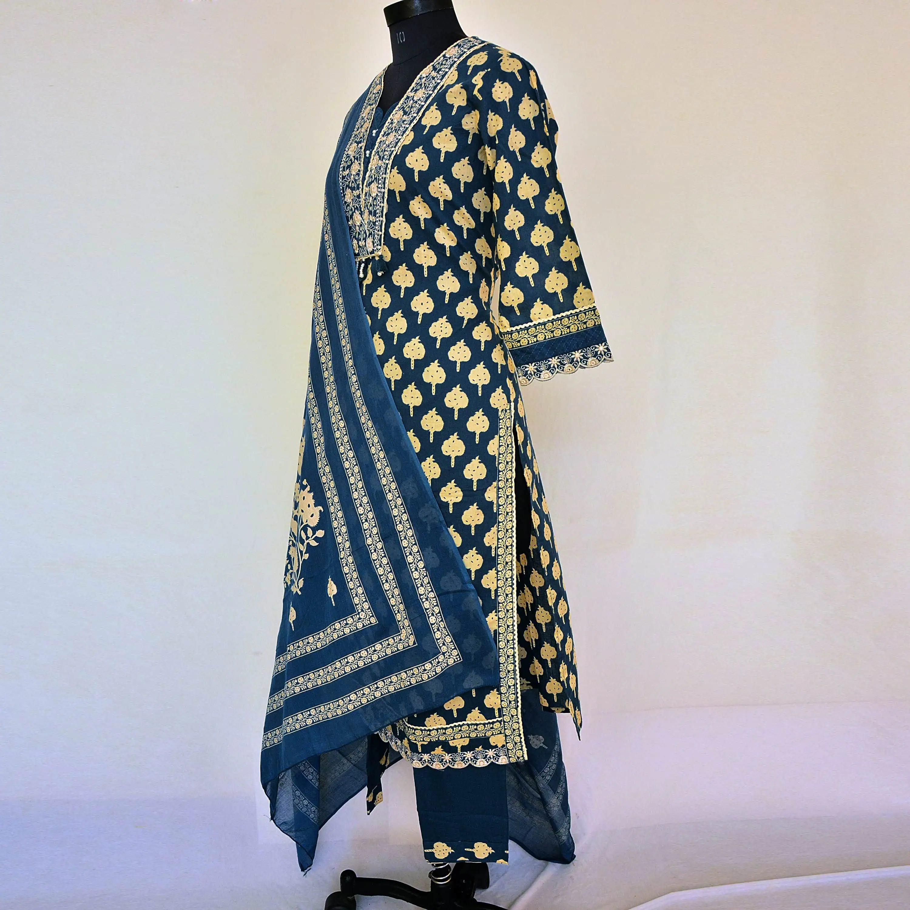 Enhance your ethnic wardrobe with CraftEarth’s Women’s Readymade Suit with Pant & Dupatta Set. Made from soft and breathable cotton, this suit set features a straight kurta with a V-neckline and 3/4th sleeves, adorned with elegant prints. The matching cotton dupatta comes with a striking border, adding a touch of grace to your look. Paired with a comfortable bottom, this outfit is perfect for festive gatherings, casual outings, or everyday office wear.