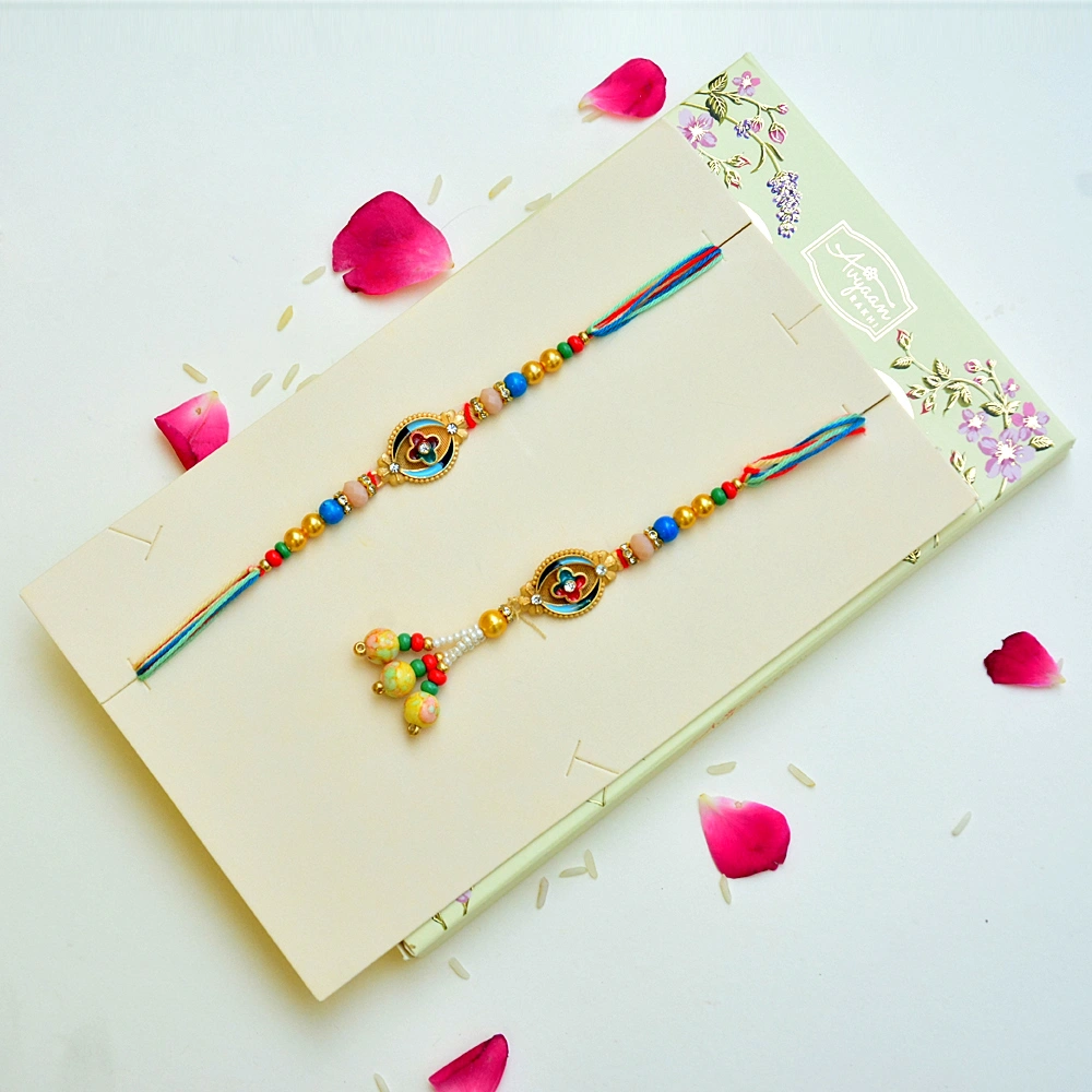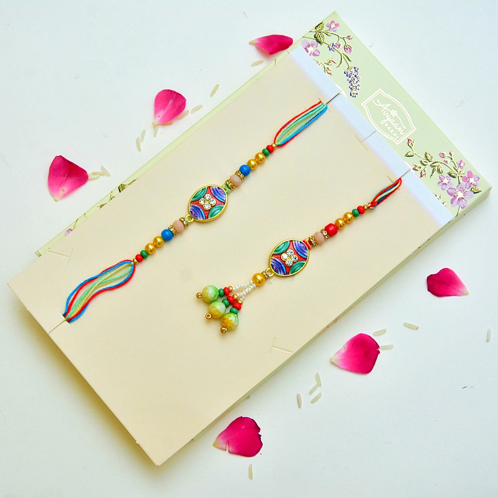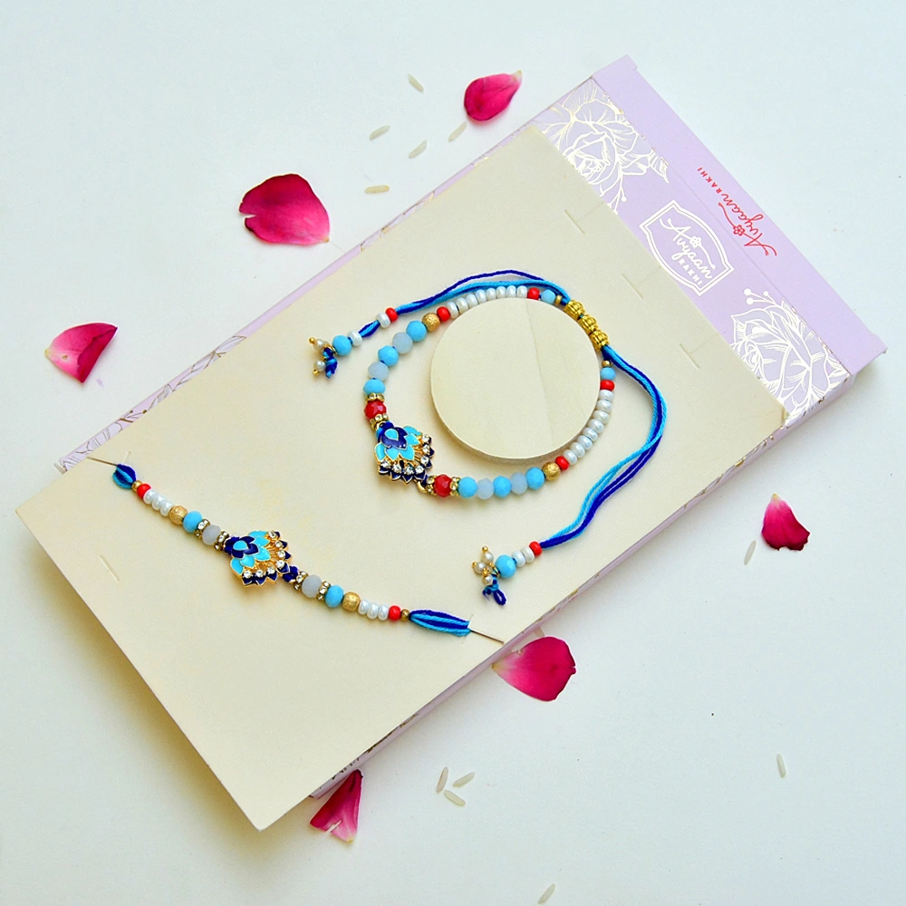 Honor the beautiful bond with your brother and sister-in-law with this charming Bhaiya Bhabhi Rakhi set – elegant, festive, and full of love.