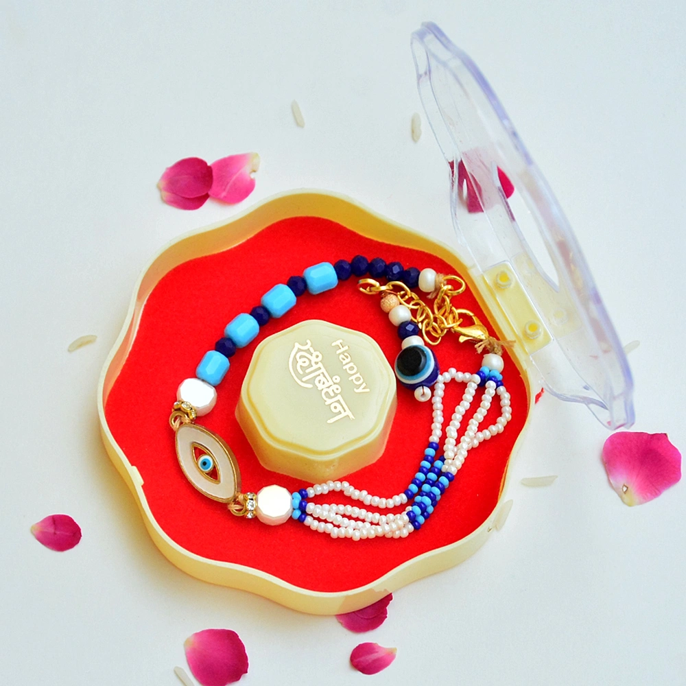 Embrace the perfect blend of tradition and modernity with this beautifully crafted Evil Eye Charm Rakhi Bracelet. Symbolizing protection from negativity and evil, this rakhi carries deeper spiritual meaning while looking contemporary and elegant. A thoughtful token for your brother to wear with pride – reminding him of your care and blessings always.