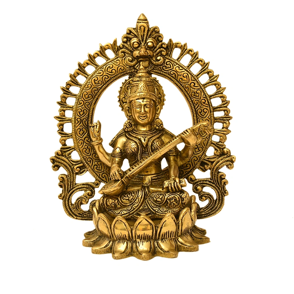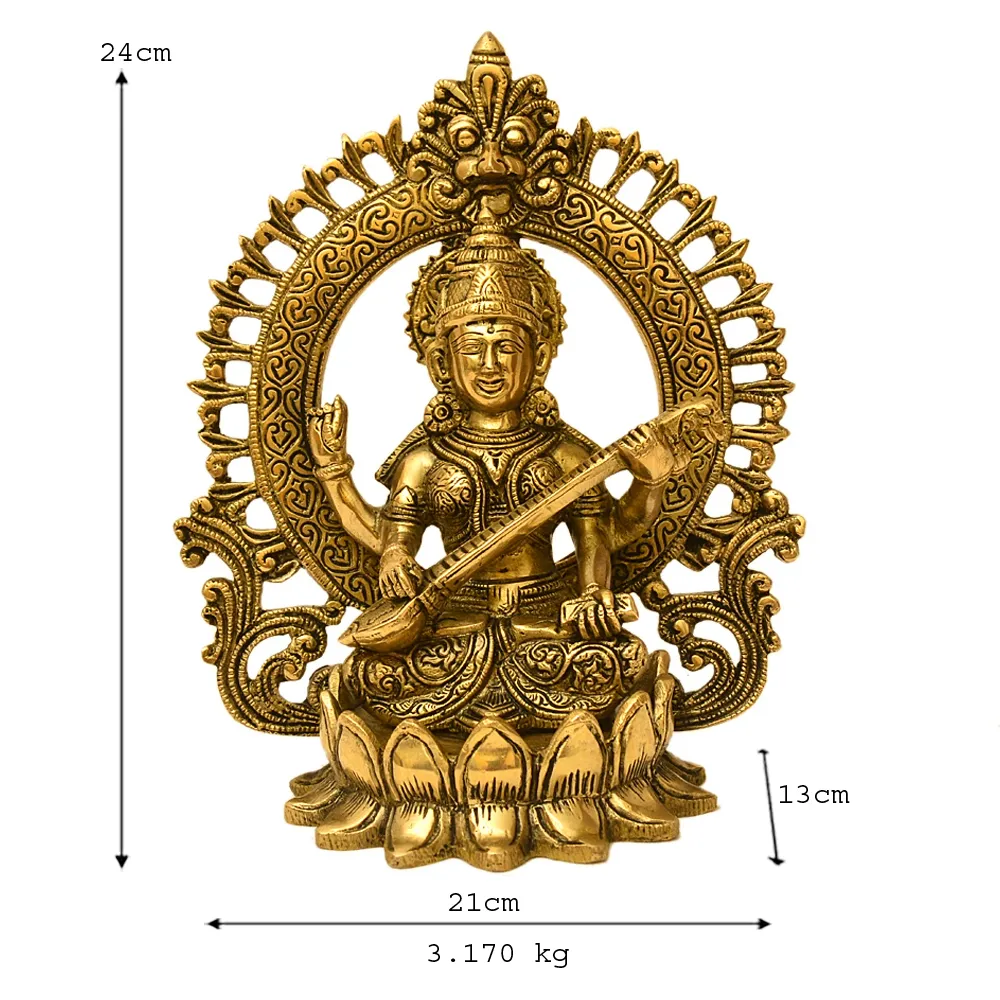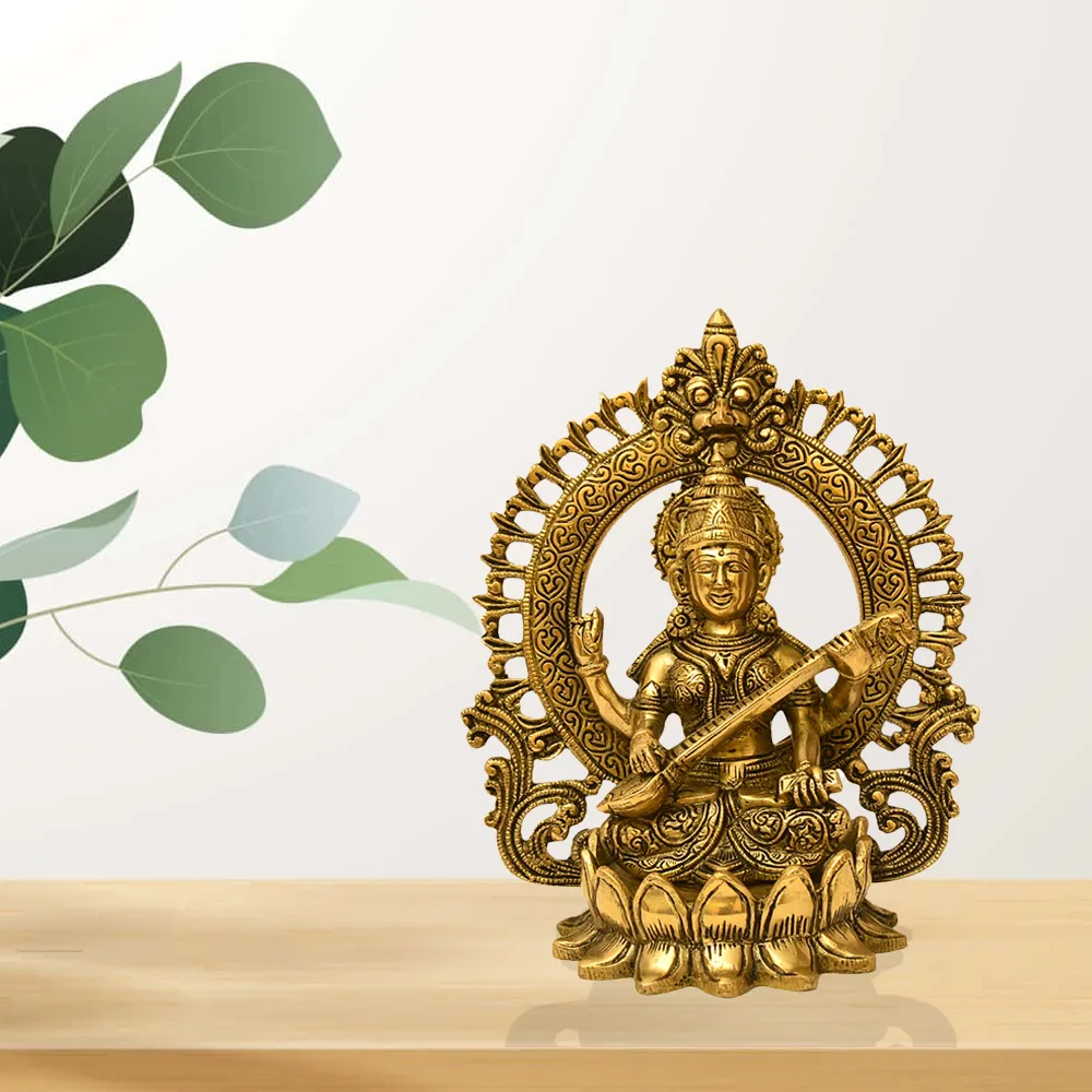 Invoke the divine energy of wisdom, music, and learning into your space with this beautifully crafted brass idol of Goddess Saraswati, the revered deity of knowledge and the arts. Made from high-quality solid brass, this sculpture features Goddess Saraswati seated gracefully on a lotus pedestal, playing the veena – a symbol of harmony and creative expression.