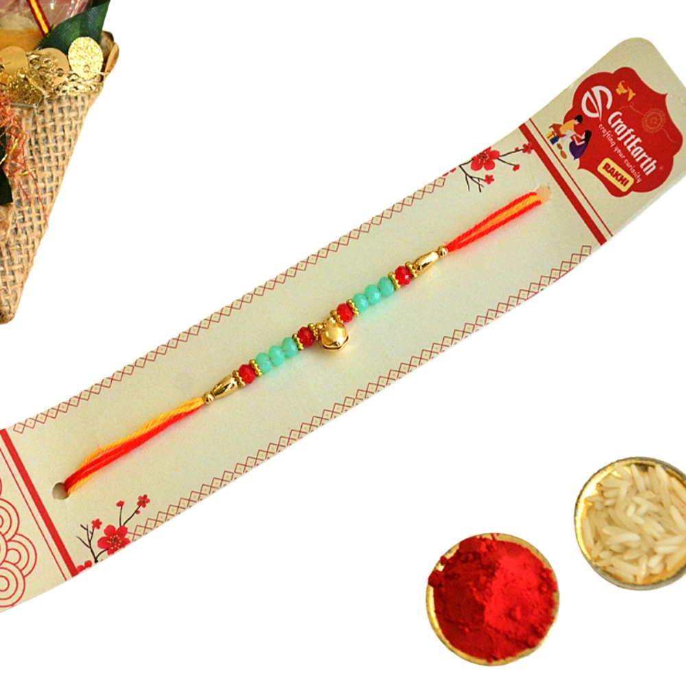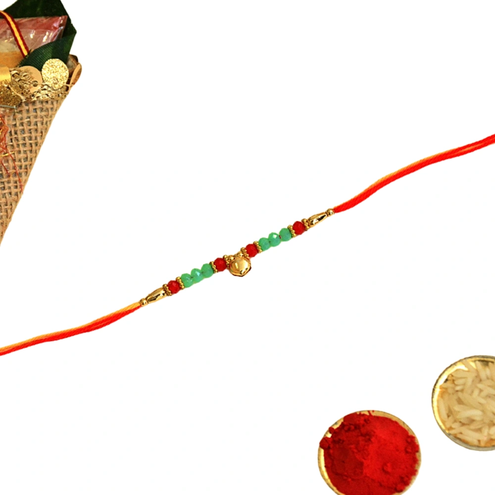 Golden Beaded Rakhi – RK-146 | Red & Green Elegance with Blessings