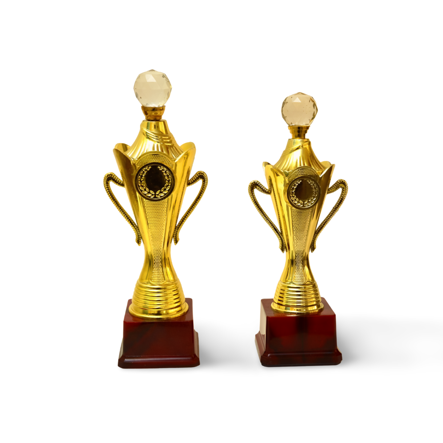 Our premium gold trophies are designed to celebrate achievements and make every occasion truly unforgettable. Celebrate success with these elegant trophies, featuring a modern and artistic design that blends elegance with boldness, a sturdy wooden base, and comes in three sizes.
