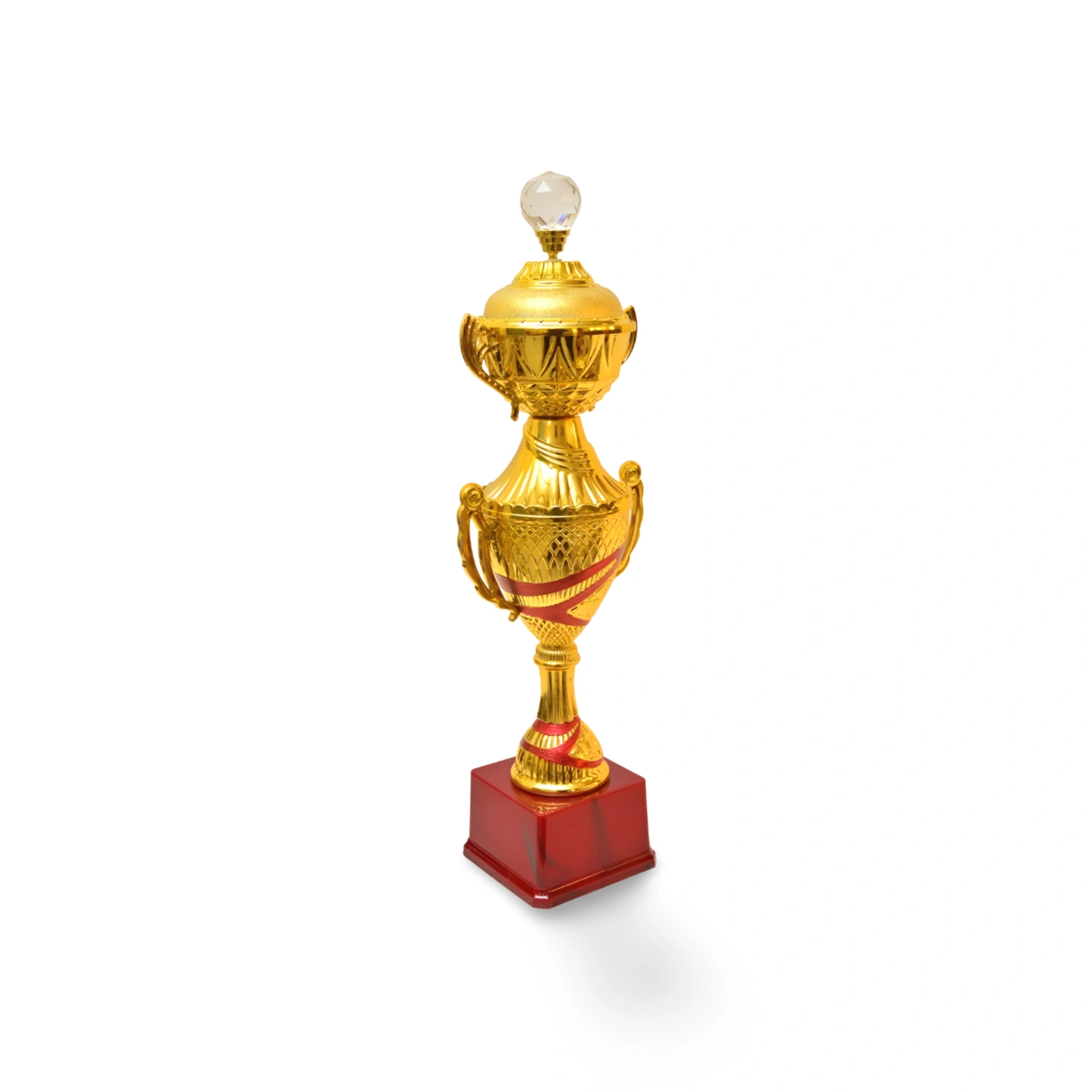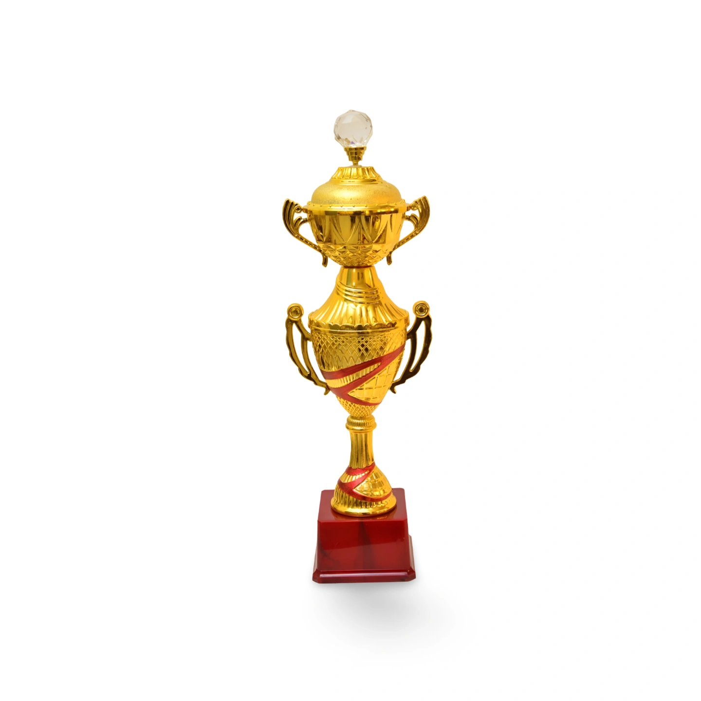 Our premium gold trophies are designed to celebrate achievements and make every occasion truly unforgettable. Celebrate success with these elegant trophies, featuring a modern and artistic design that blends elegance with boldness, a sturdy wooden base, and comes in three sizes.