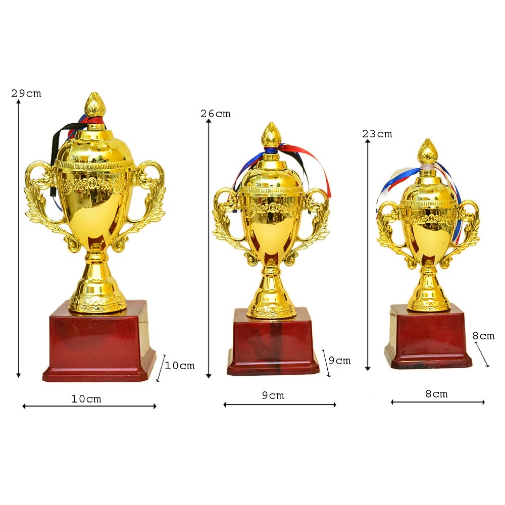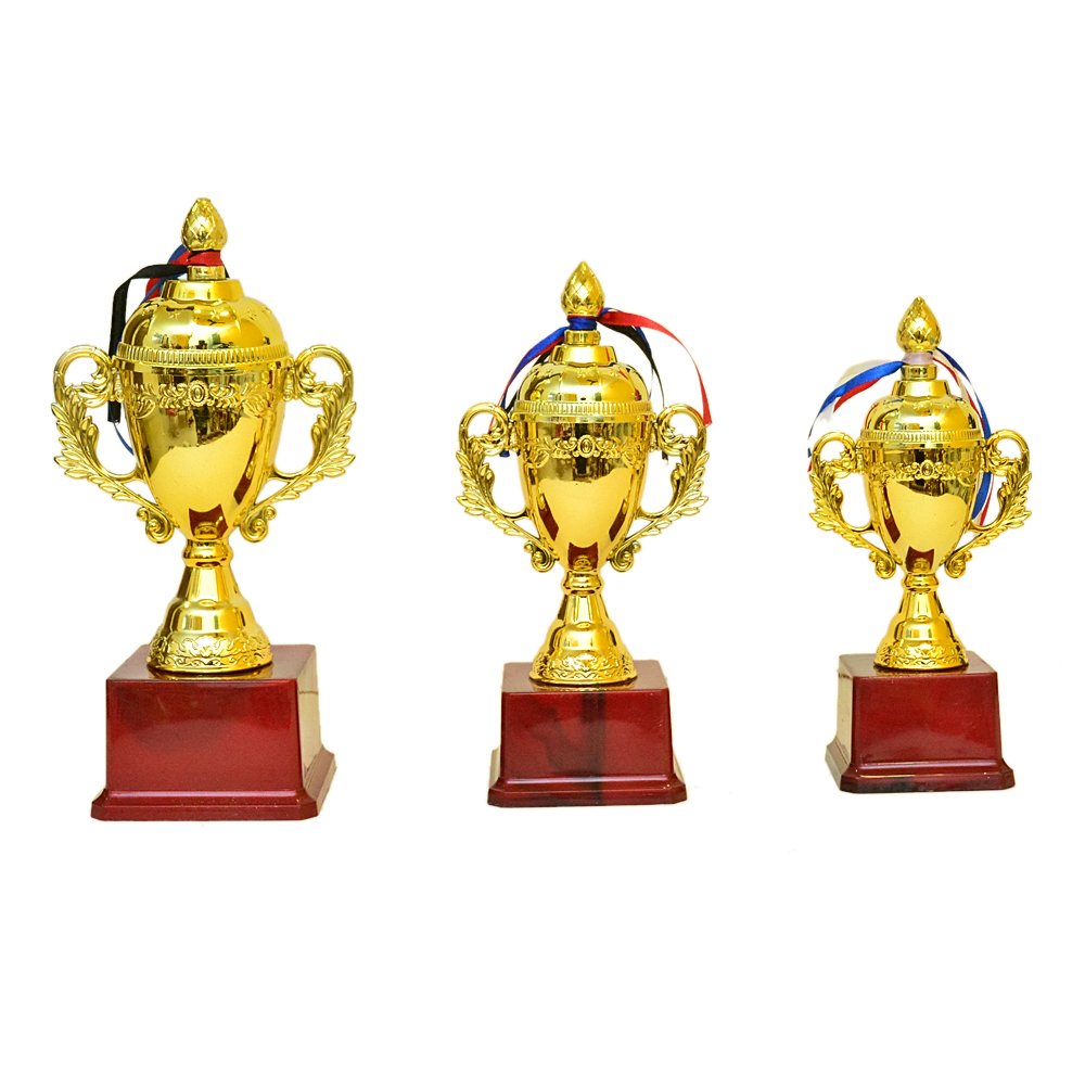 Our premium gold trophies are designed to celebrate achievements and make every occasion truly unforgettable. Celebrate success with these elegant trophies, featuring a modern and artistic design that blends elegance with boldness, a sturdy wooden base, and comes in three sizes.