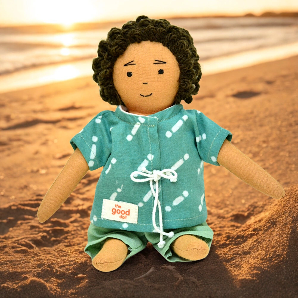 Meet Reghu, a calm and kind handmade fabric doll wearing a soft sage-green kurta with delicate white dots and matching cotton shorts. His fluffy curly hair, hand-embroidered features, and soothing colours make him a perfect companion for mindful play and quiet cuddles.
