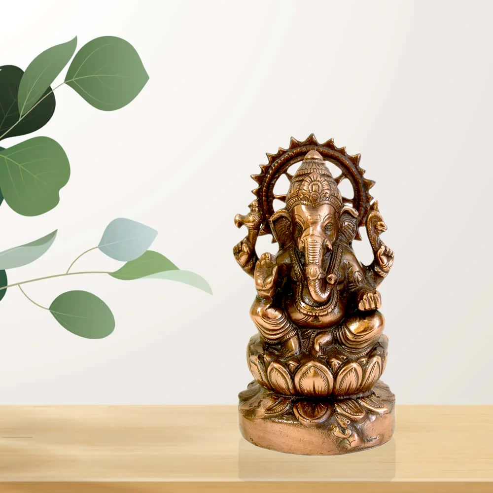 Enhance your home, office, or puja room with this intricately handcrafted Lord Ganesha idol in an antique copper finish. Symbolizing wisdom, success, and prosperity, this Ganpati murti is perfect for creating a peaceful and spiritual ambiance. Whether for worship or decor, this divine idol makes an excellent addition to any space.