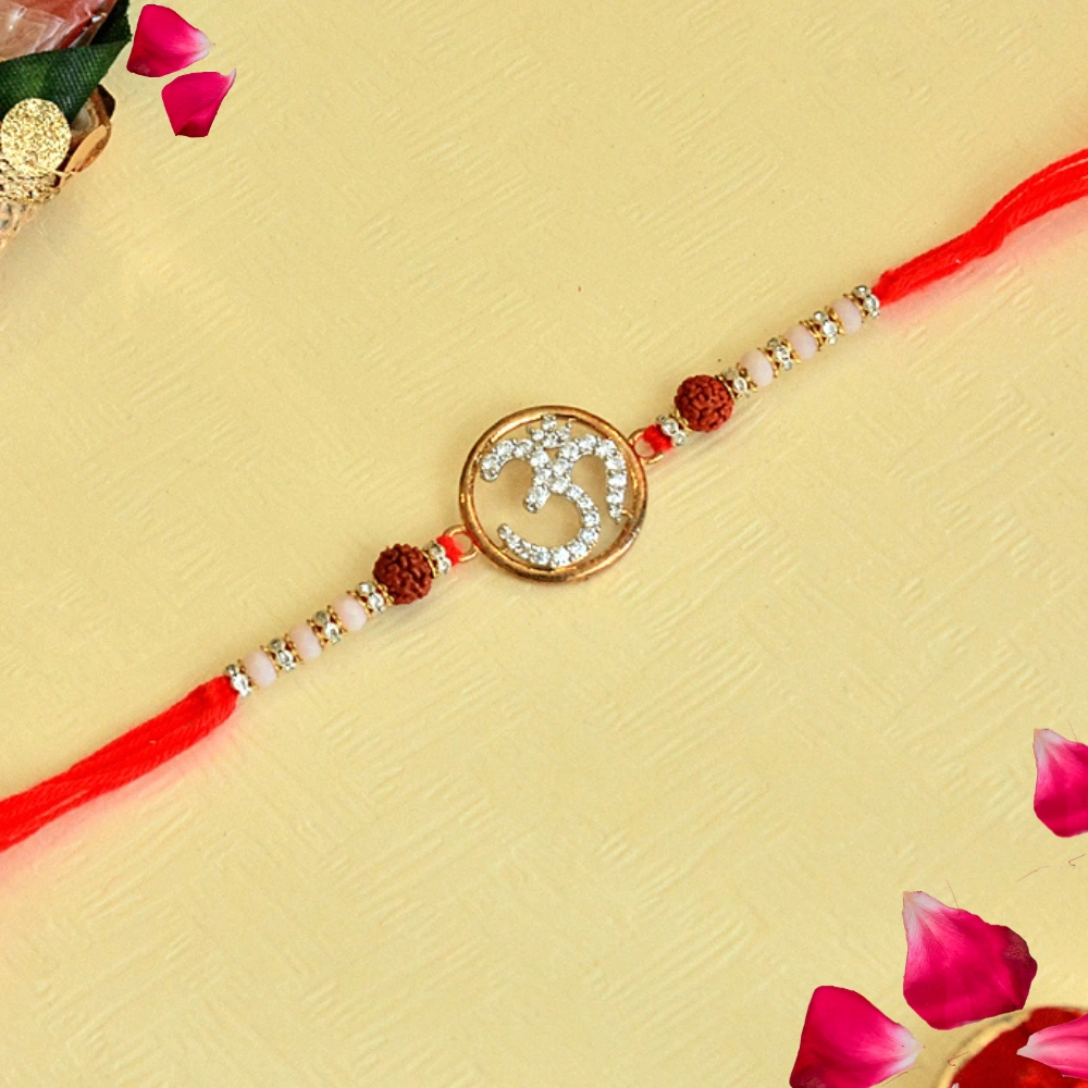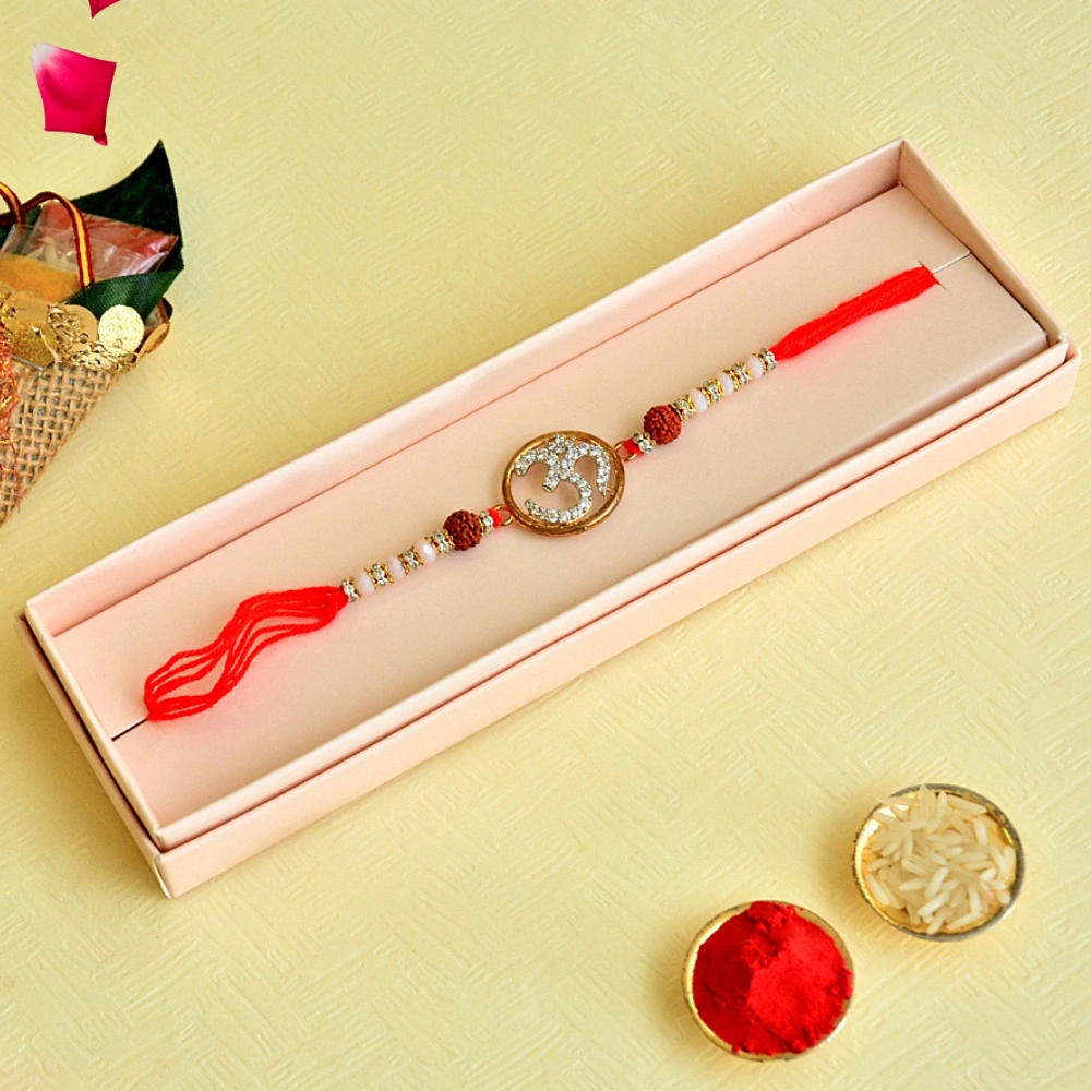 Spiritual Om Rakhi – RK-117 | Red Thread with Rudraksha & Pearl Beads