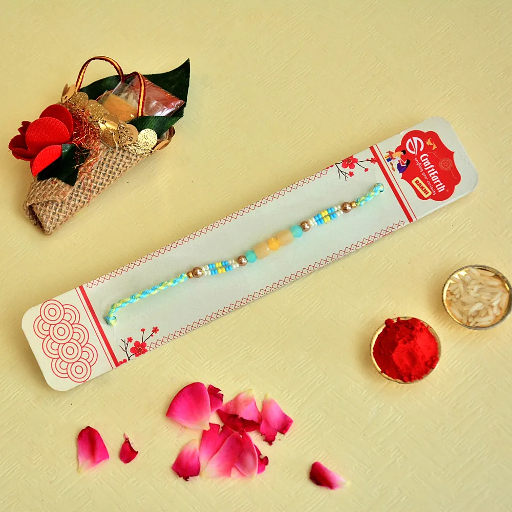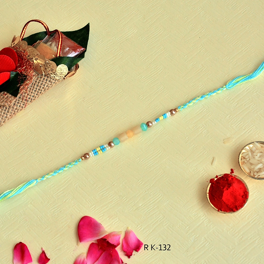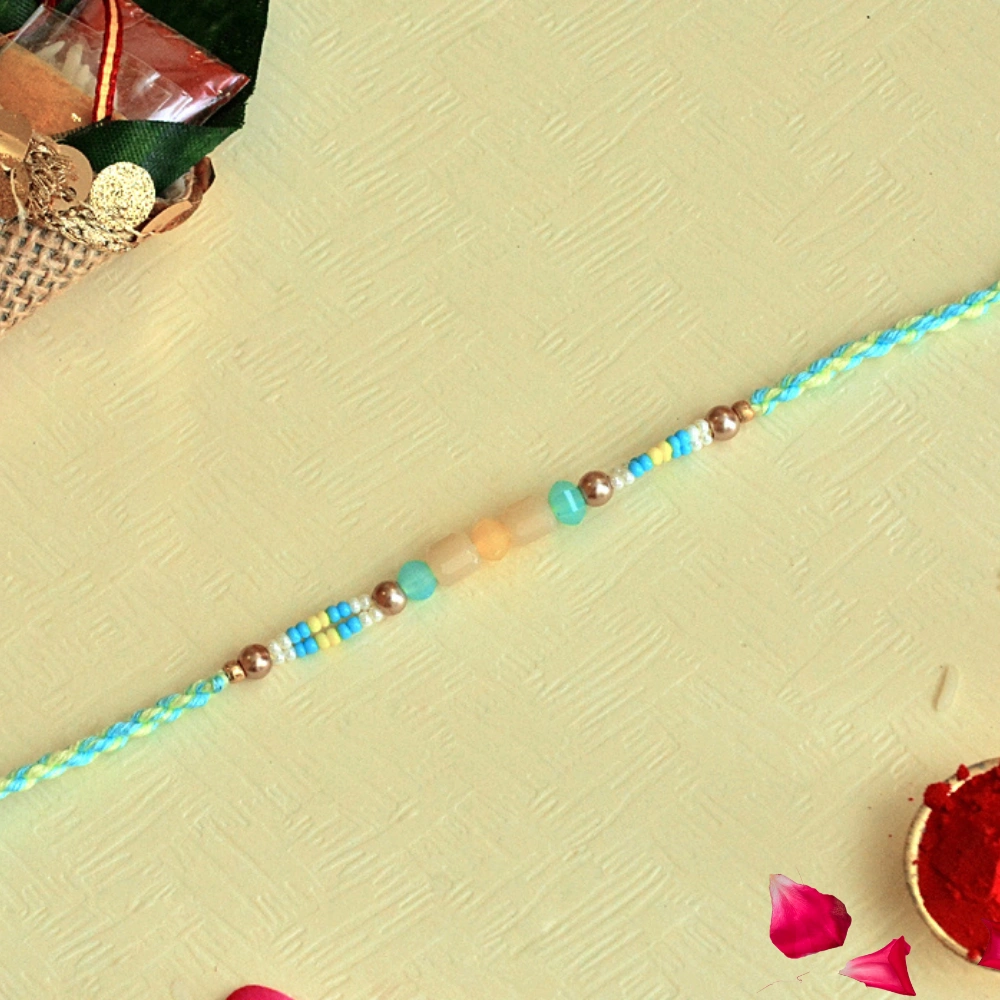 Summer Breeze Rakhi – RK-132 | Aqua Blue Thread with Yellow Beads & Metallic Accents