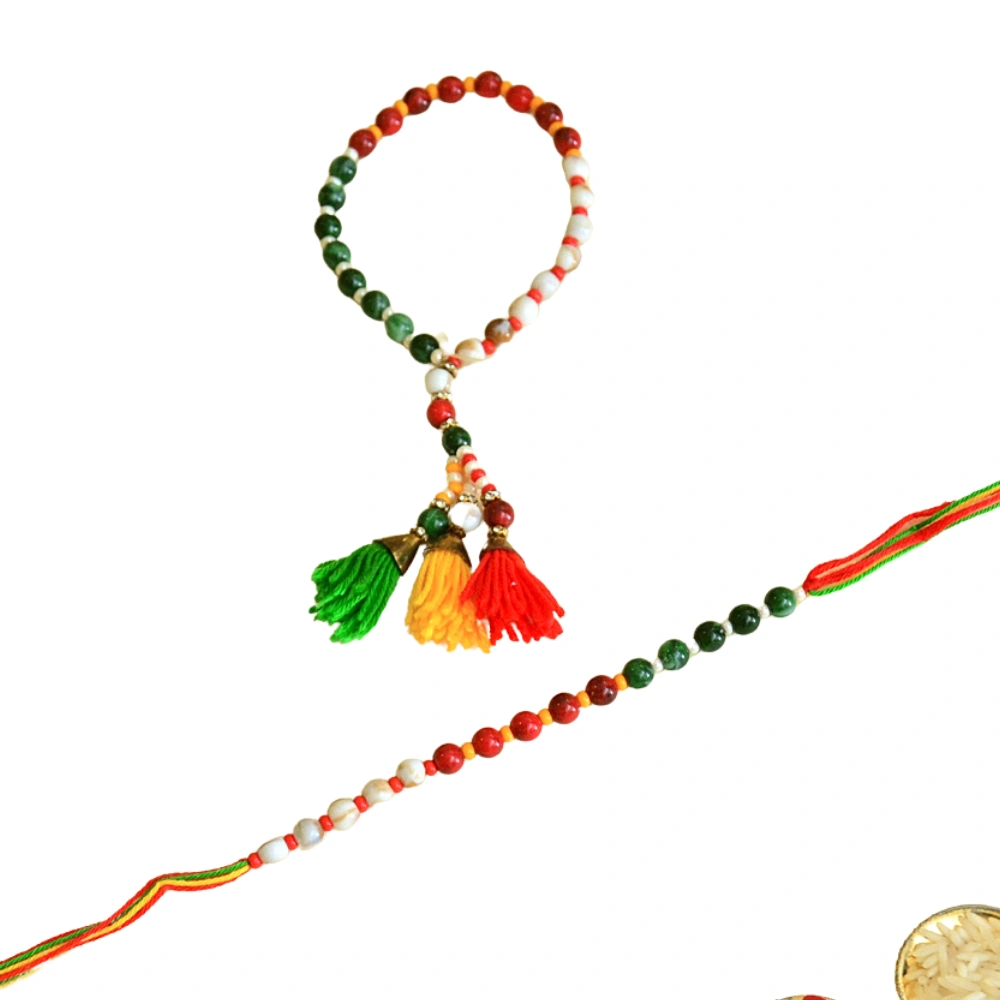 Traditional Bhaiya Bhabhi Rakhi Set – RK-134 | Multicolor Beaded Rakhi with Tassel Lumba for Bhabhi