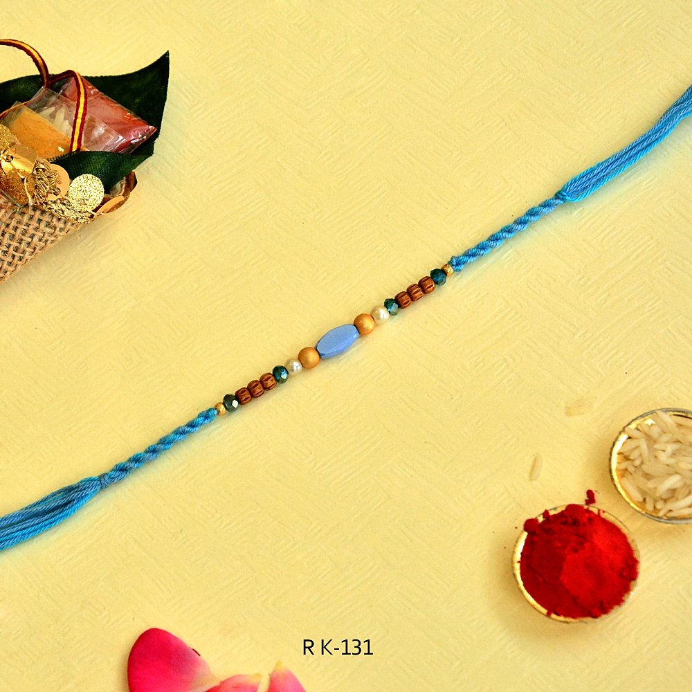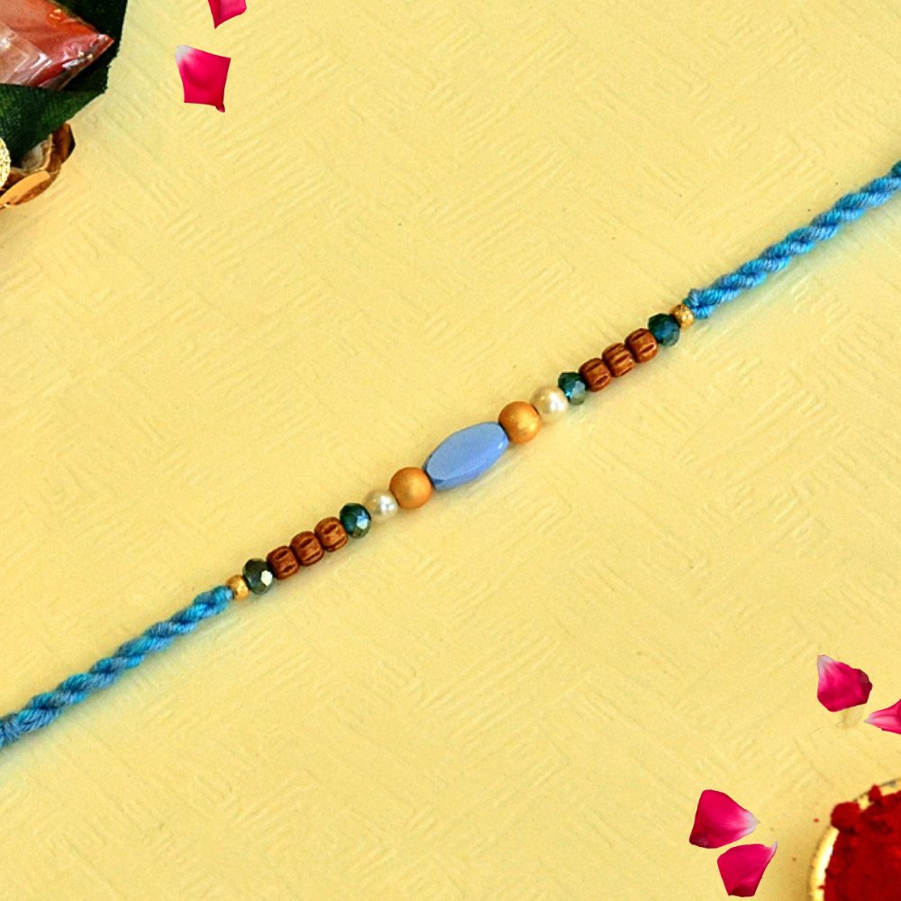 Tranquil Blue Rakhi – RK-131 | Sky Thread with Oval Bead & Wooden Accents