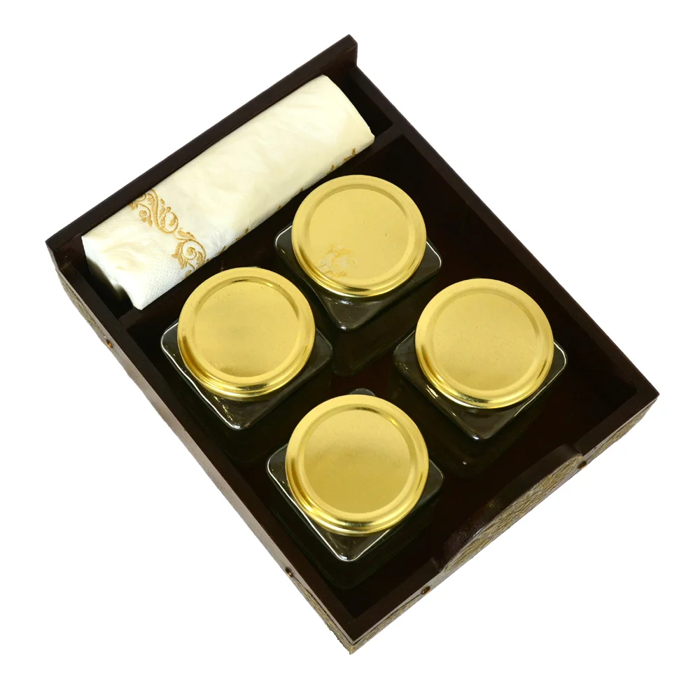 - Multi-Functional Design: Comes with 4 glass jars with airtight golden lids, perfect for storing spices, condiments, dry fruits, or tea leaves. Also features a dedicated section for napkins/tissues.