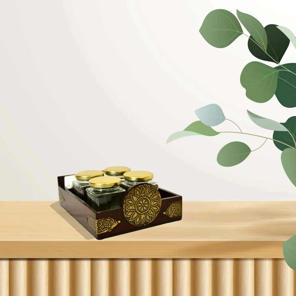 - Premium Craftsmanship: Beautifully handcrafted wooden spice jar organizer with intricate brass detailing, adding elegance to your kitchen or dining space.